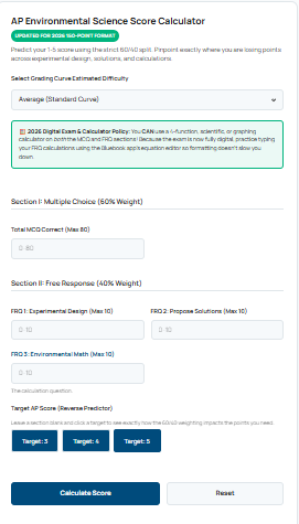 Use these exact inputs to test our ap environmental science score calculator logic. We show the math step by step. You can see exactly how raw points turn into a final grade.