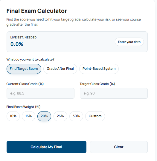 If you are asking "what do I need to get on my final exam calculator," the formula relies on your current grade, goal grade, and final exam weight. Our final exam calculator determines this by calculating the maximum possible points remaining. Whether you are using this as a high school final exam calculator or a college final exam calculator, the math is universal. (Note: if your teacher uses raw points instead of percentages, use our final exam calculator points based mode above).